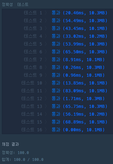 이렇게 짜는게 맞는 가는 음... 테스트코드도 다 통과하고, 제출도 100점이 나온다. 일단 다른 사람 풀이를 보면서